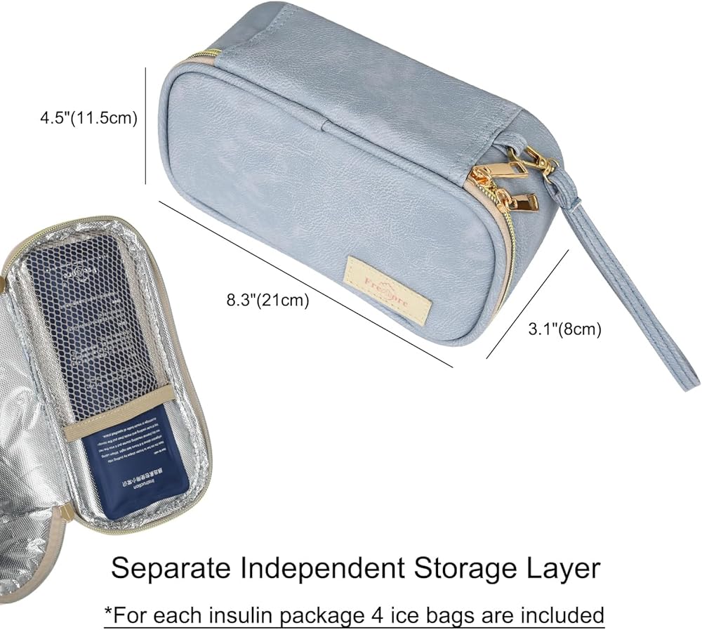 【HOW TO USE】--Put the 2 pieces ice packs in the Freezer more than 8 to 10 hours before using the insulin bag outside. Then put your insulin pen, refill, or insulin needles into the designated areas of the bag.