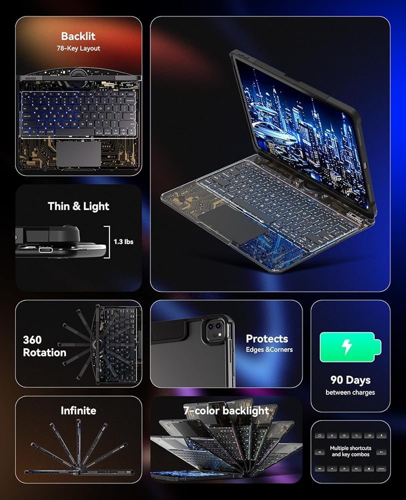 iGENJUN iPad Keyboard with Case for iPad Air 13 Inch(M3 2025 / M2 2024) and iPad Pro 12.9 Inch (6th, 5th, 4th, 3rd Gen), Wireless Keyboard, 7-Color Backlit, 360°Rotating, with trackpad