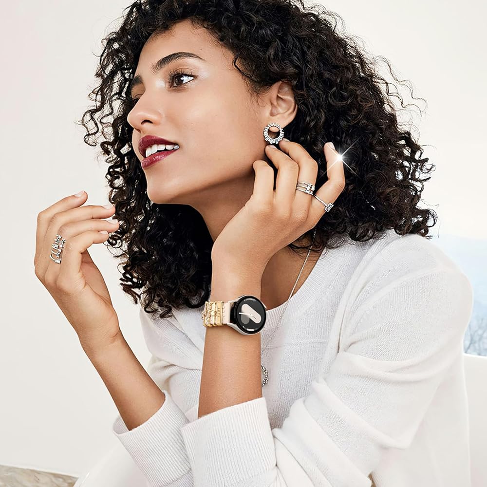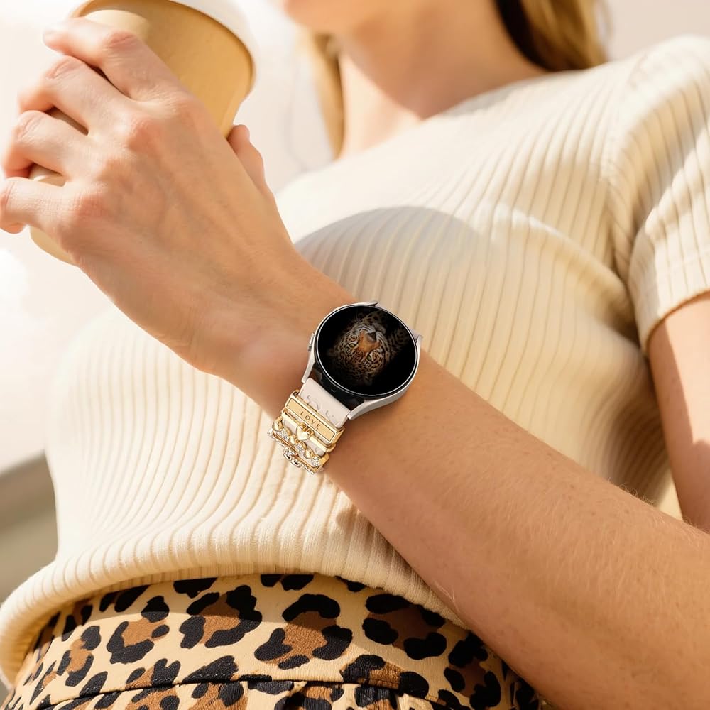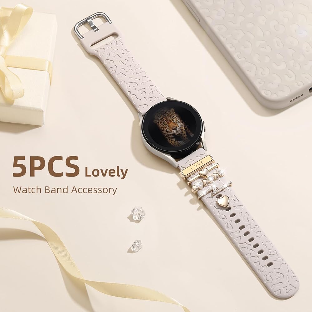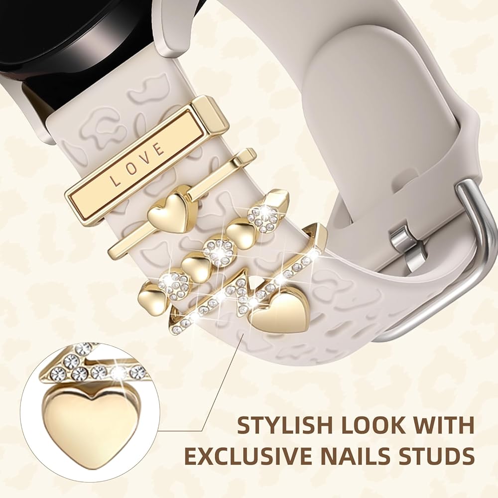 【Attractive Design & Trendy Accessories】 This leopard-print band is adorned with 5pcs sparkling decoration,The shiny charms can be easily switched to match your outfit or bag, helping you stand out from the crowd. Wear them together or separately, and mix and match according to your preferences for a fresh look every day.The decorative charms measure up to 22mm in width and 3mm in thickness, ensuring a wide fit for most smartwatch bands.