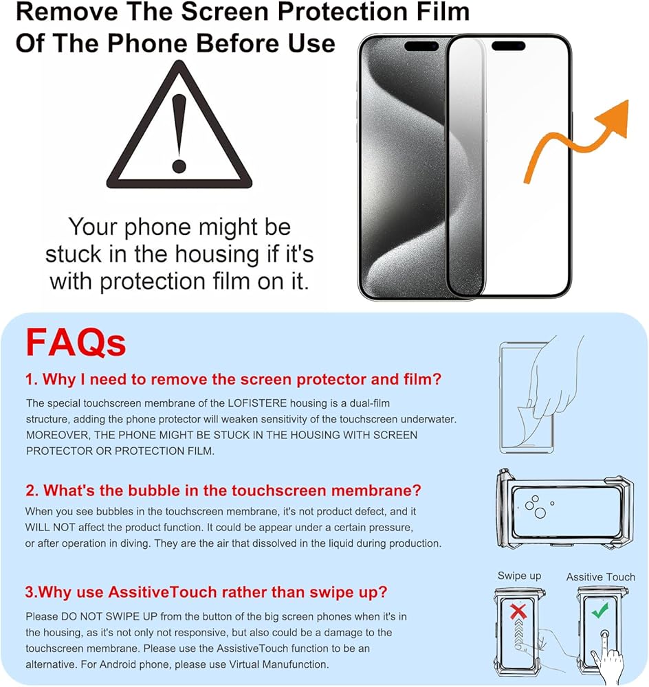 Professional Underwater Photography Phone Case: The touch screen waterproof phone case can adjust the phone camera mode and parameter settings, which can provide impressive high-quality photos and videos when diving. You can even shoot underwater movies. Note: Please remove the screen protector before use. Keep the phone camera mode to quickly wake up the camera.