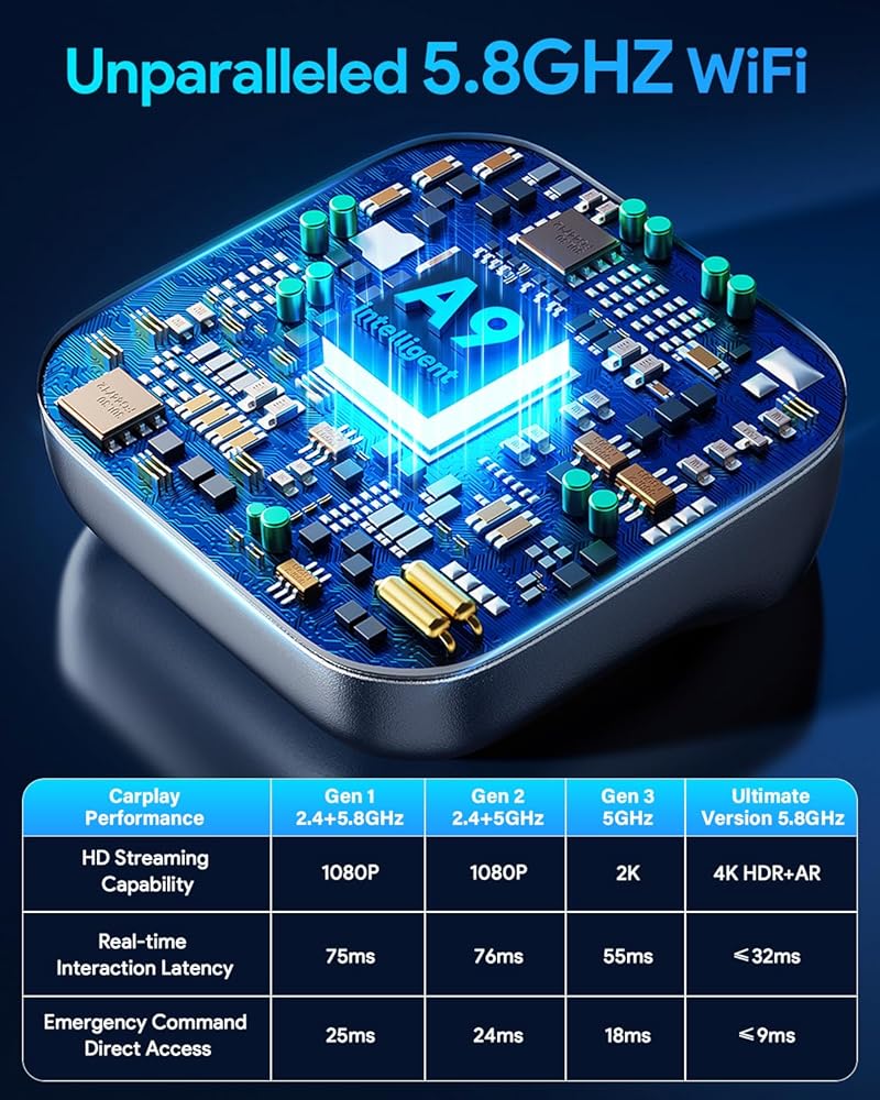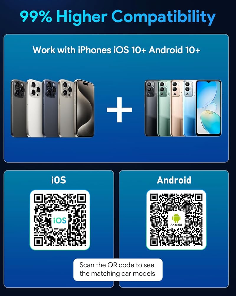 التوافق الواسع والسلامة المعتمدة: يعمل مع أعلاه iOS 10.0+ للكاربلاي اللاسلكية ، وهواتف Android التي تعمل بنظام Android 10.0+ على Android Auto. متوافق مع 99 ٪ من السيارات مع carplay السلكية الأصلية (أكثر من 1000+ نموذج). معتمد من قبل CE و ROHS و FCC ID و Telec و ISED ، مما يضمن الاستخدام الآمن والموثوق في سيارتك.
