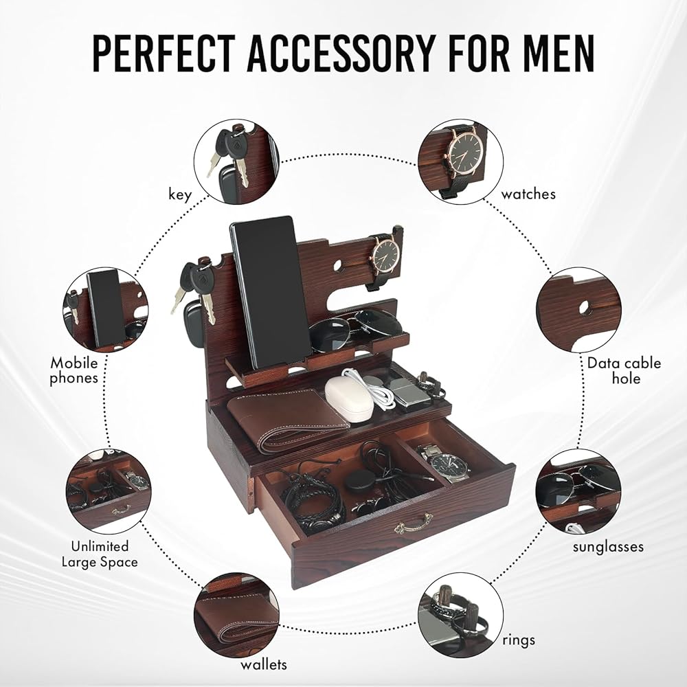 Premium Solid Wood That Lasts- Crafted from high-quality solid wood, this docking station is built to last—far more durable than plastic alternatives. Its rich dark brown wood grain and smooth finish add a touch of natural elegance, blending seamlessly into any home or office décor. A stylish and sturdy organizer that complements your space while keeping essentials in order.