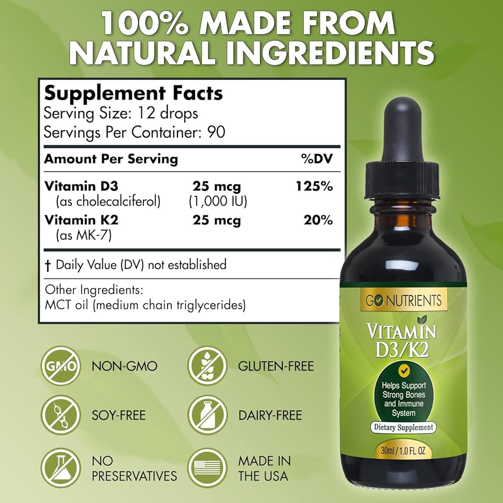 INGREDIENTS: Go Nutrients vitamin D with K2 drops contains 25 mcg of Vitamin D3 as cholecalciferol and 25 mcg of Vitamin K2 as MK-7. Other Ingredients include MCT oil, which is derived from GMO-free palm oil and/or coconut oil.