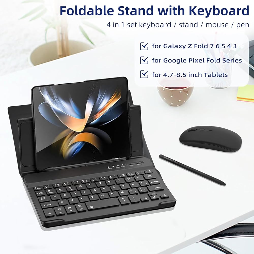COMPATIBILITY: Elevate your productivity on the go with our all-in-one keyboard case set, designed for seamless compatibility with Samsung Galaxy Z Fold 7 6 5 4 3 2, Google Pixel Fold series, iPad mini series and any 4.7“-8.5” mini tablets. This versatile sets allows you to work efficiently, whether you're in a café, at the office, or traveling
