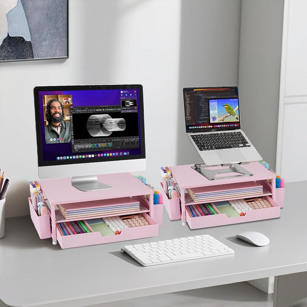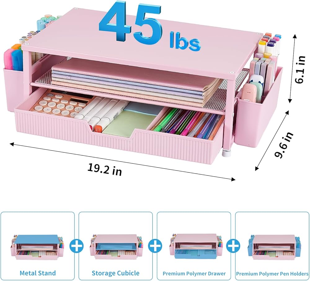Desk Organizer: This computer monitor stand features a 2-tier design that provides more storage space. The office organizer come with 2 pen holders and drawer for office supplies