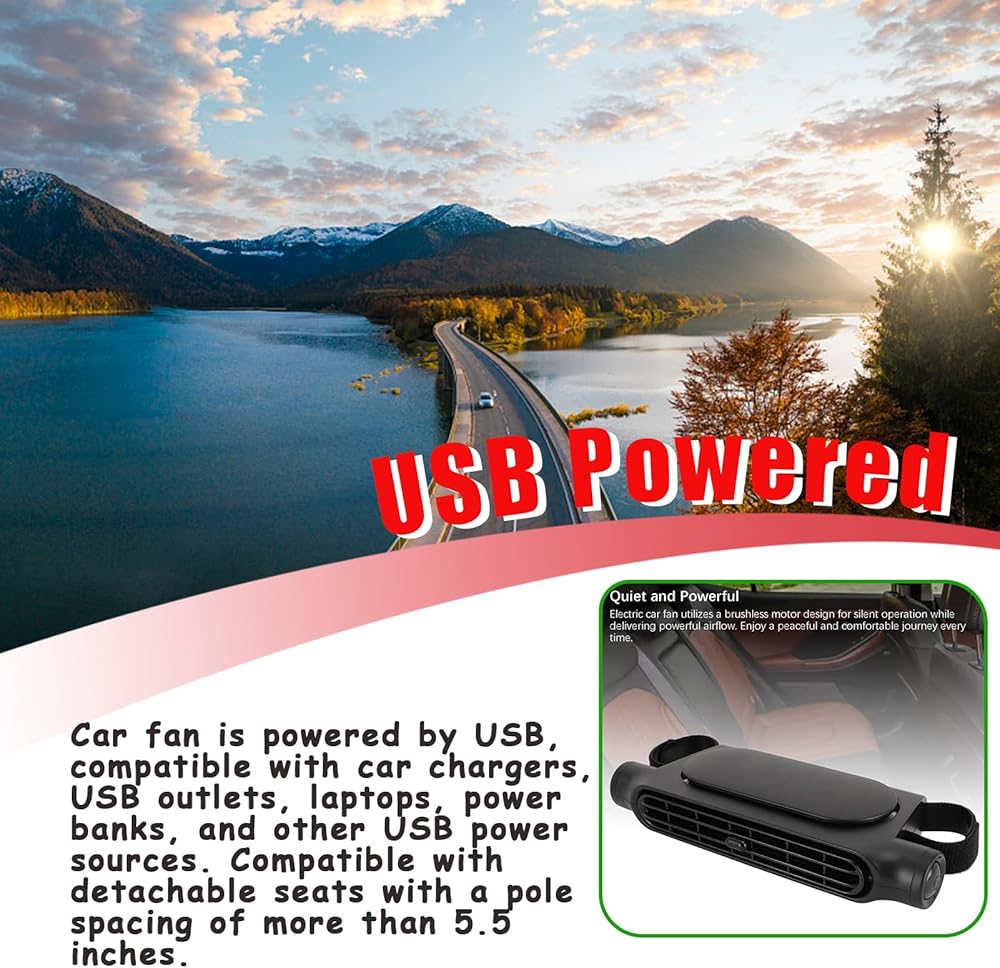 [UNIVERSAL COMPATIBILITY] Operating on USB power, this car seat fan is highly efficient and energy-saving. It works seamlessly with a variety of USB-enabled power sources, such as car chargers, power banks, and laptop USB ports. This makes it incredibly convenient to use, whether you're on the go or at home. You don't have to worry about finding a specific power adapter or dealing with complicated wiring. Just plug it in, and you're ready to enjoy the cooling benefits.