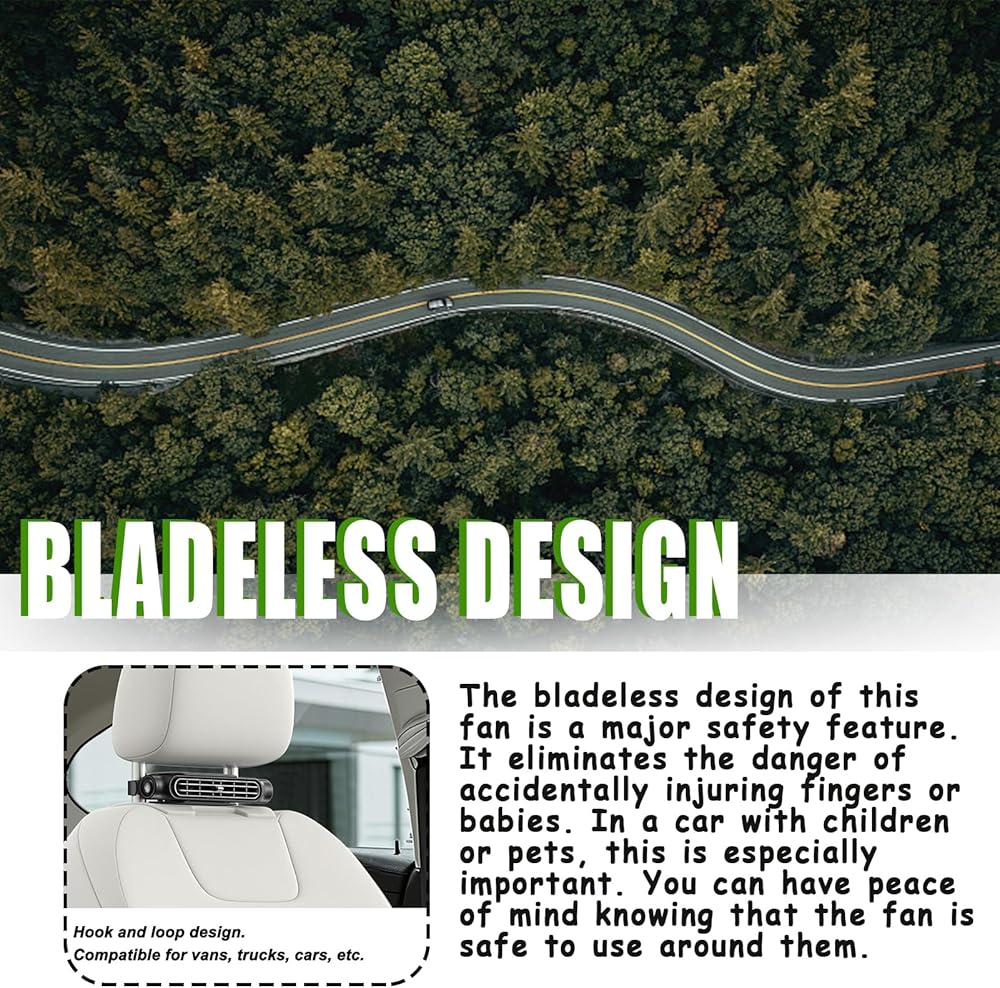[BLADELESS DESIGN] The bladeless design of this fan is a major safety feature. It eliminates the danger of accidentally injuring fingers or babies. In a car with children or pets, this is especially important. You can have peace of mind knowing that the fan is safe to use around them. The bladeless design also provides a more pleasant cooling experience for the whole family, as there's no risk of getting caught in the blades or feeling a harsh breeze.