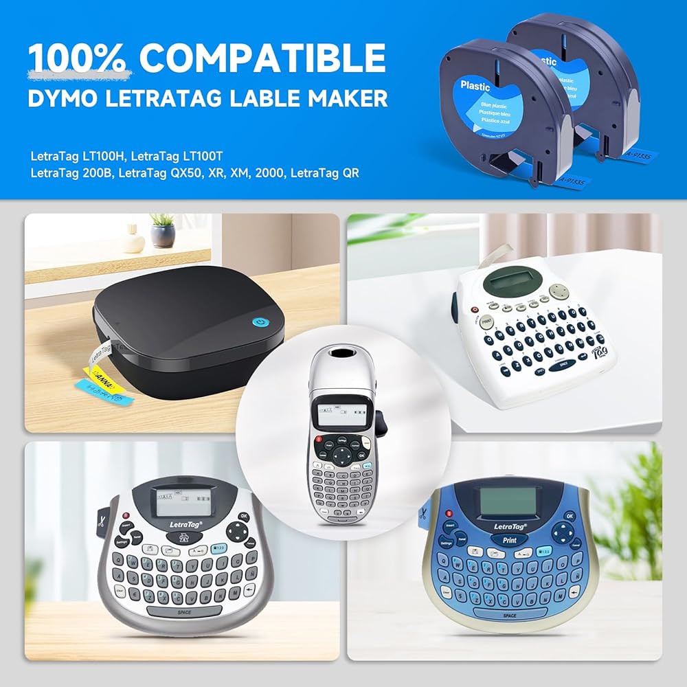 Color & Dimension: Compatible with Dymo letratag refills blue, NON-OEM label tapes. Color: black on blue; Size 1/2 inch (12mm) width x 13 feet (4m) length. LetraTag tape comes in a variety of colors. 5rolls for dymo Label Maker refill packed in a box