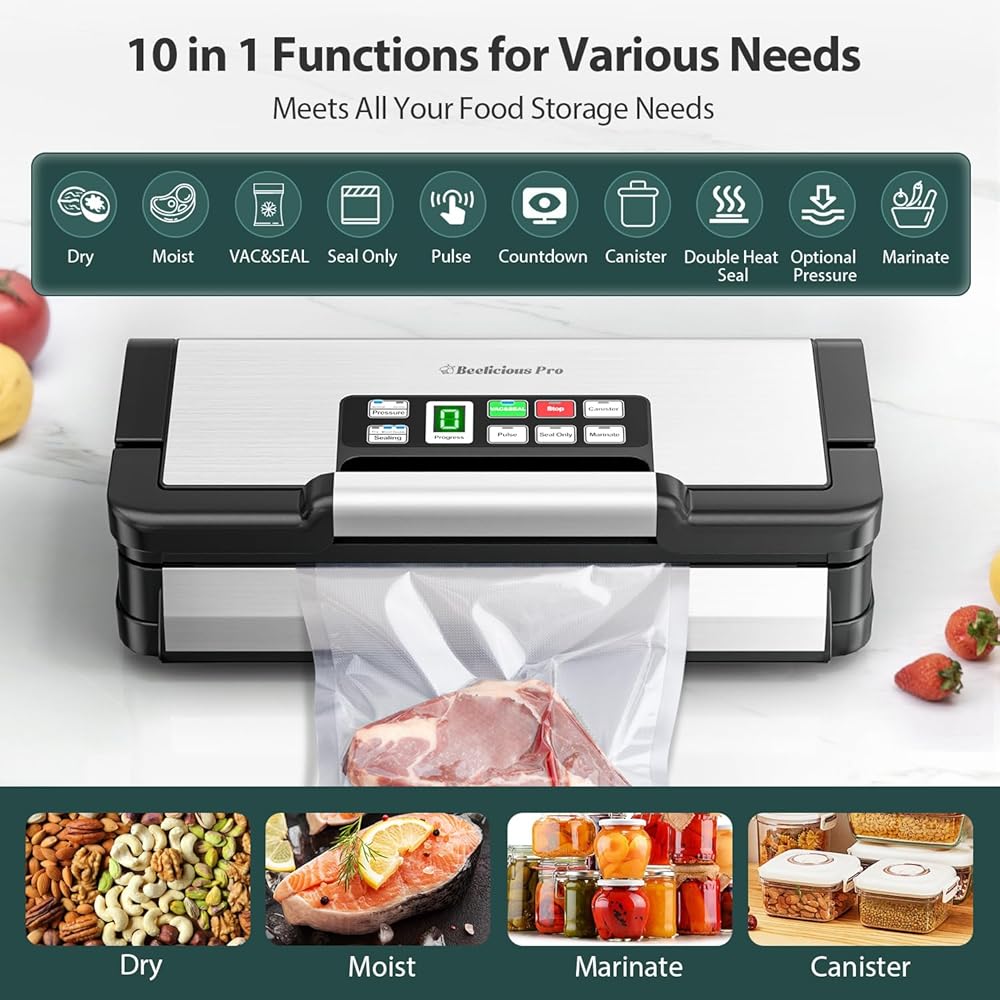 Beelicious Pro 90Kpa Powerful Vacuum Sealer, with 10-in-1 Functions,Double Seal & Double Pump,Built-in Cutter&Hose,Handle-Ease Design, Vacuum Sealer Machine for Food with Bags Storage, Stainless Steel