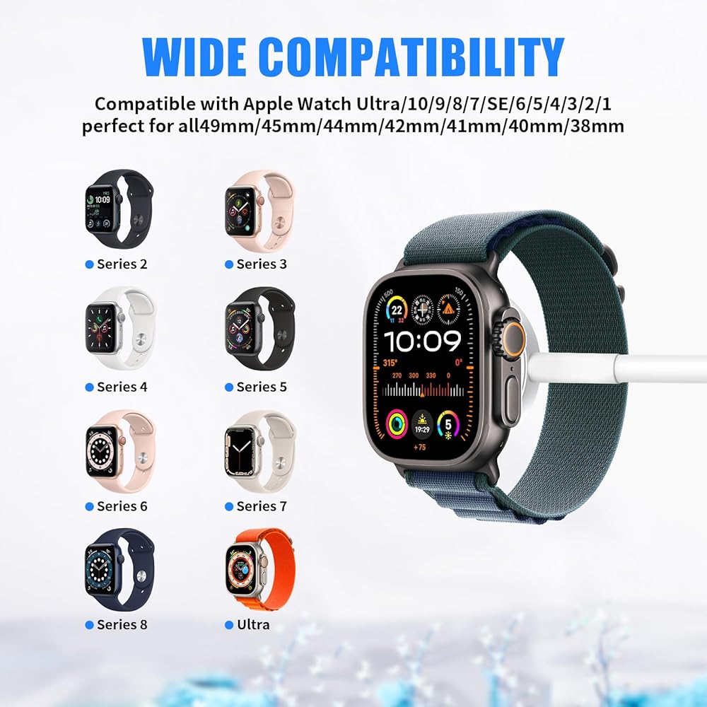 Compatible for Apple Watch Series: Our iwatch charger cable Compatible with Apple Watch Ultra 2 /Ultra /Series 10 /Series 9 /Series 8 /SE (2nd Gen) /Series 7 /SE /Series 6 /Series 5 /Series 4 /Series 3 /9 /8 /7 /6 /5 / 4 /3 /2 /1 (including 38 mm 40 mm 41 mm 42 mm 44 mm 45 mm 49mm Version)