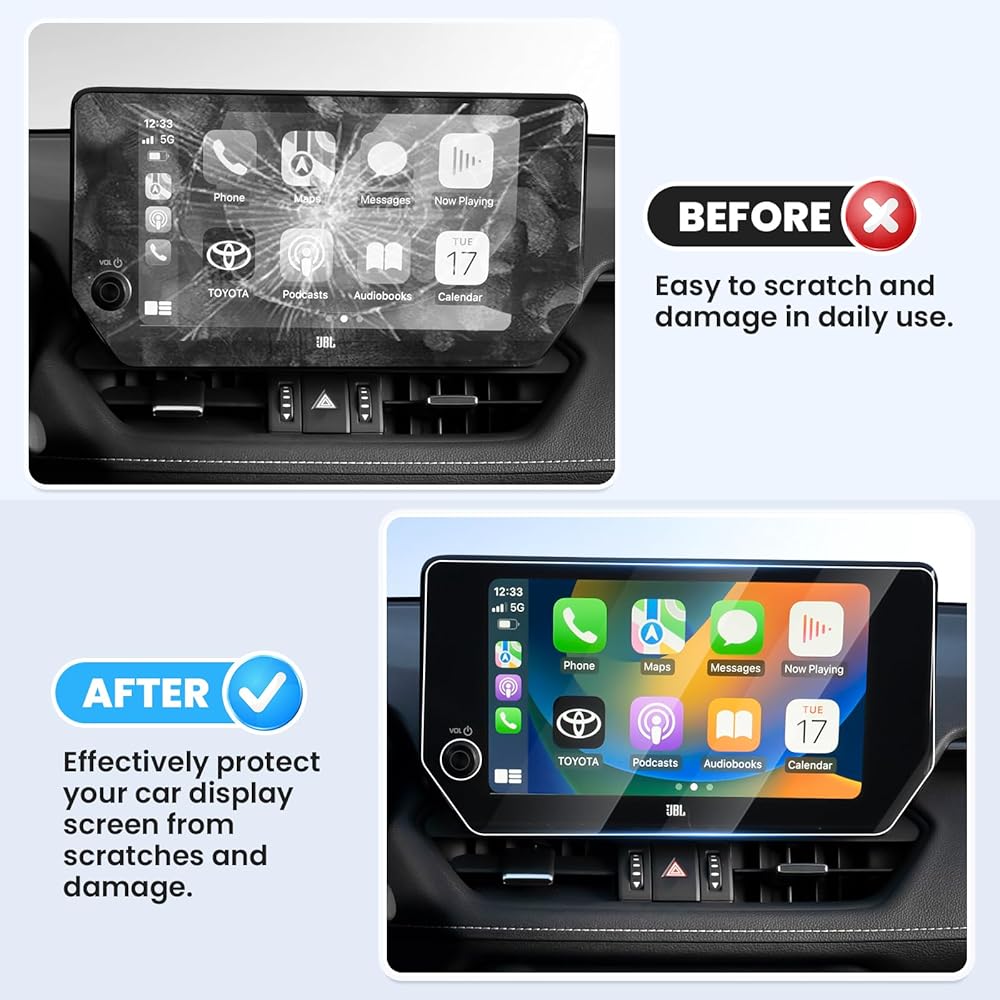 【9H Hardness】9H hardness tempered glass touch screen protector effectively prevents scratches and damage on car display screen. Not easy to shatter, durable and sturdy, waterproof and oil proof. Perfect for maintaining the aesthetics of the touch screen.