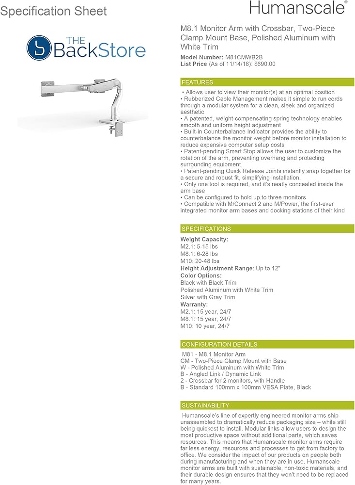 Humanscale M8.1 Adjustable Dual Monitor Arm with Crossbar - Two Piece Clamp Mount - Silver M81CMSB2B In today's fast-paced, agile work environment, there's no time for discomfort. M8.1, part of Humanscale's revolutionary new monitor arm line, instantly improves the comfort, health and productivity of any workspace. Fully compatible with traditional desks and sit/stand workstations alike, M8.1 meets a variety of configuration needs for single monitors from 6 to 28 pounds or – with an optional crossbar support – dual monitors up to 12 pounds each. Featuring innovations like Humanscale's patented Weight-Compensating Spring Technology and Smart Stop functionality, M8.1 enables the personalization and flexibility needed for today's evolving workplaces. M8.1 supports a better working posture, creates more usable desktop space and helps maintain a clutter-free environment. It offers quick, simple installation and industry-leading flexibility thanks to Quick Release joints that instantly snap together for a secure and robust fit.