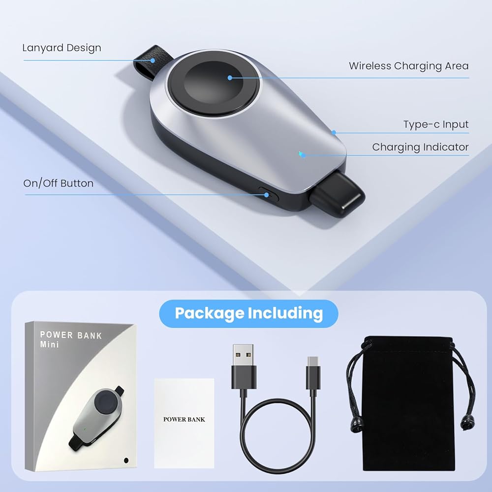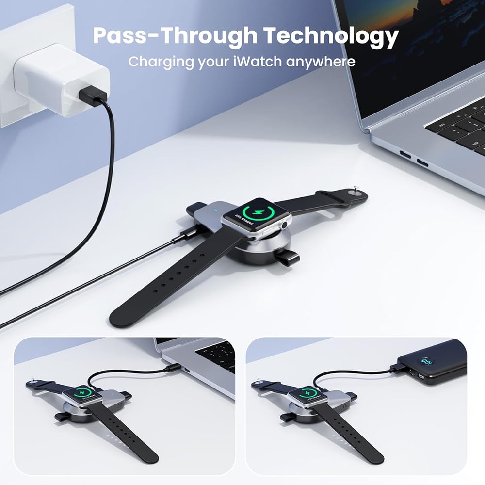 【Safe Protection & Dual Pass-Through Charging】 Portable wireless charger built-in intelligent chip can protect your devices against over-discharge, over-charge, short-circuit or overheating. Portable charger support Pass-Through Function: Charge your iWatch while recharging the power bank, ensuring you never miss a moment.