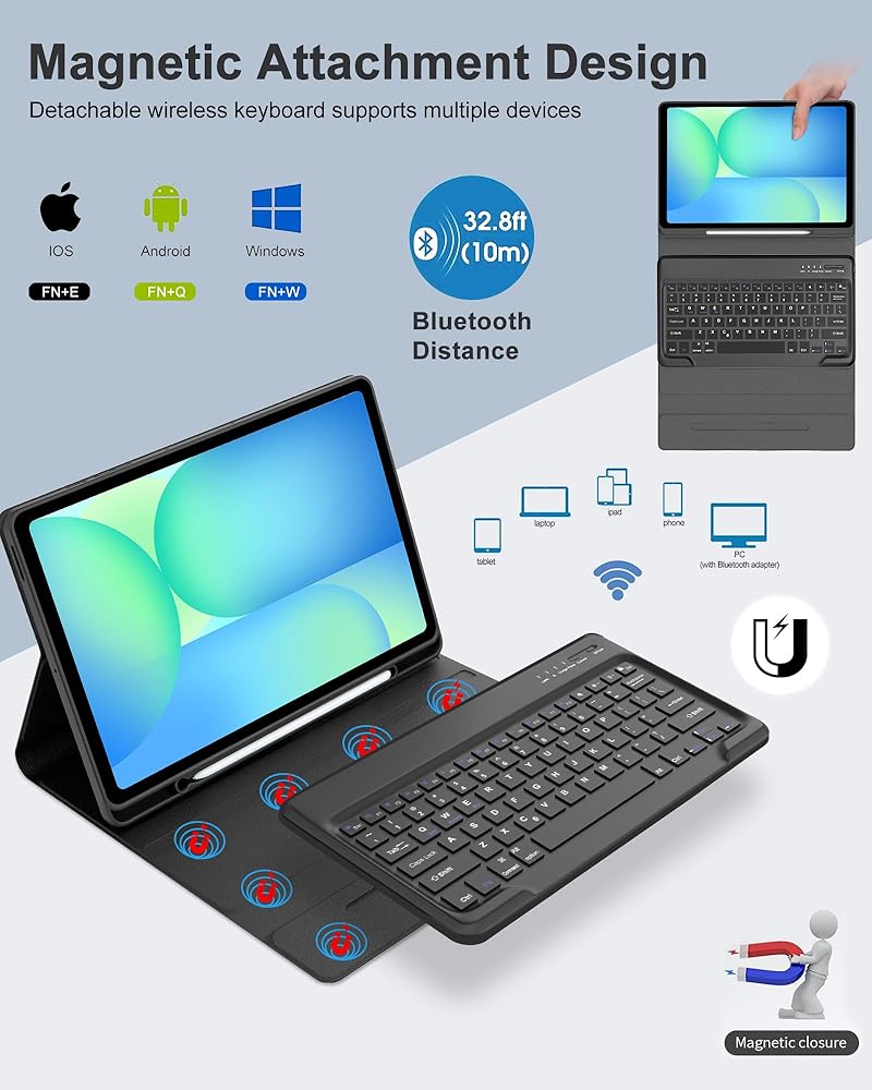 【Keyboard Functionally】Magnetically detachable super slim 5mm and light weight bluetooth keyboard with 10M range. And the book cover keyboard tab s10 fe + with strong magnetic keyboard gives you a stable platform for typing that won't move easily.