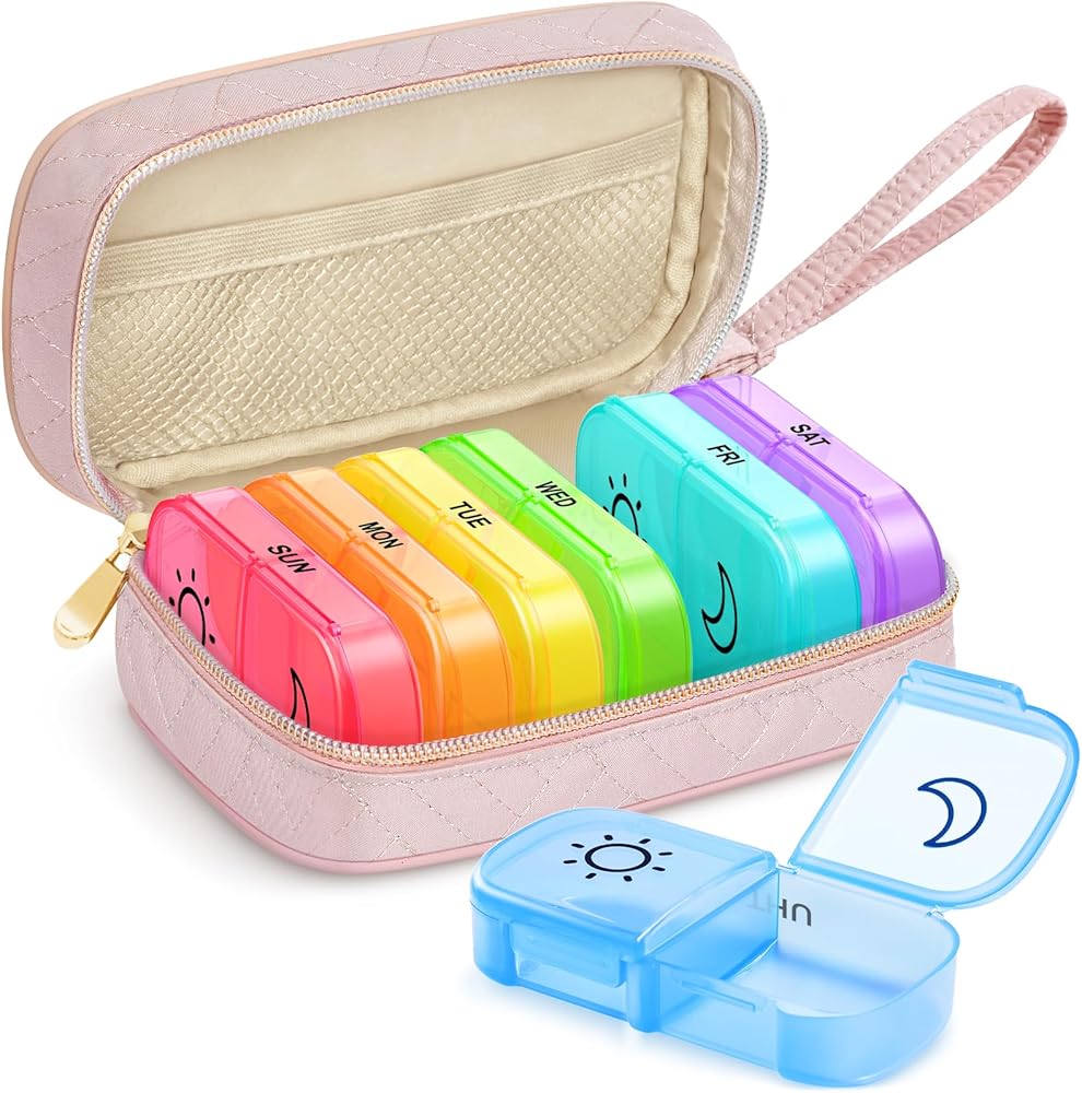 Stylish ZIKEE Weekly Pill Organizer 2 Times a Day, Pill Box 7 Day with Soft Peach-Skin Fabric & Detachable Handle for Travel, Pill Case for Vitamin/Fish Oil/Medicine/Supplements (Pink)