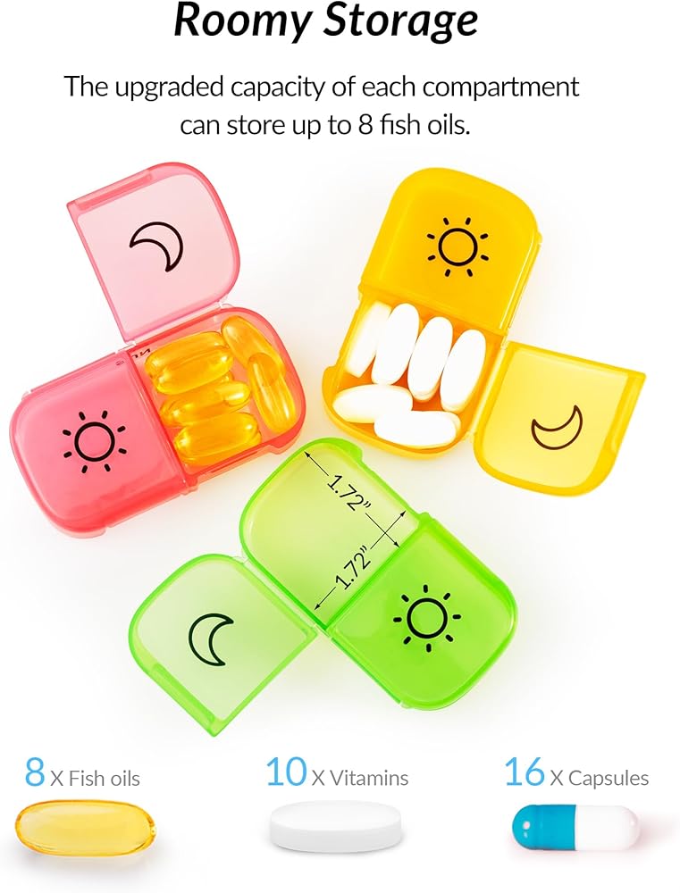 Large Capacity Meets Your Need: Each compartment of this large pill container with upgraded capacity can store up to 8 fish oils. The supplement organizer with a compact design is the ideal companion for travel, ensuring your necessary supply is always within reach.