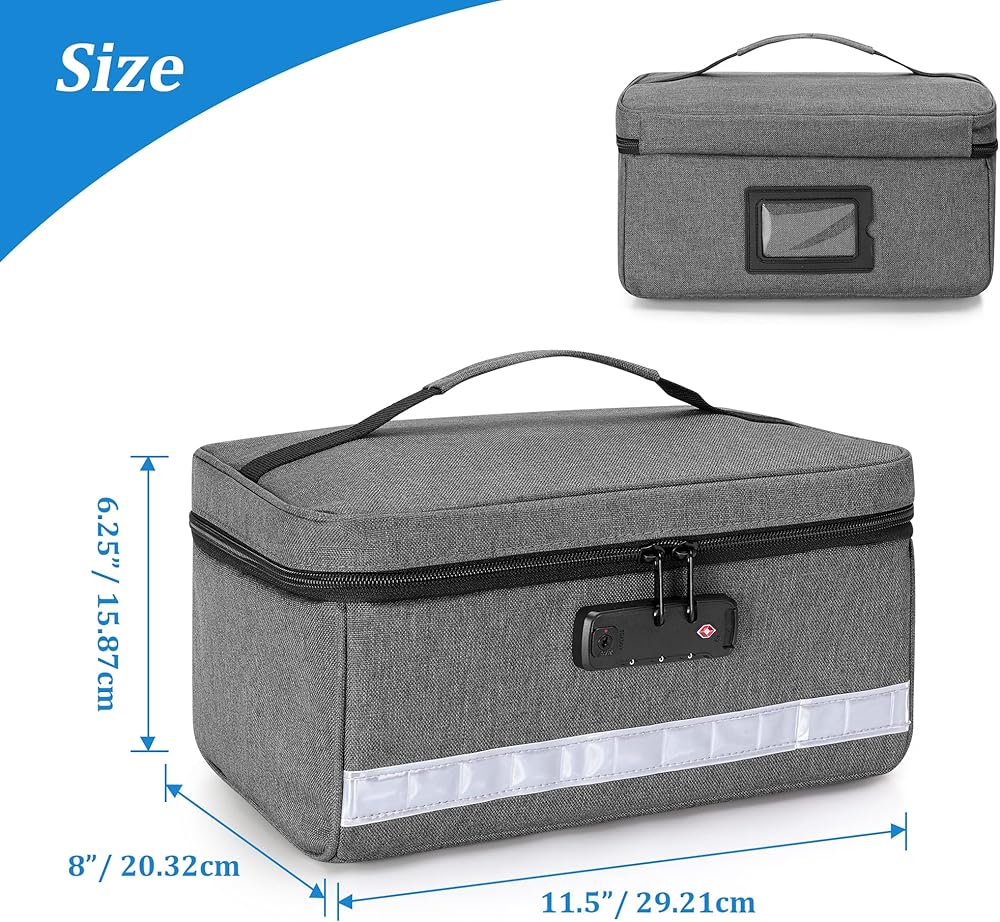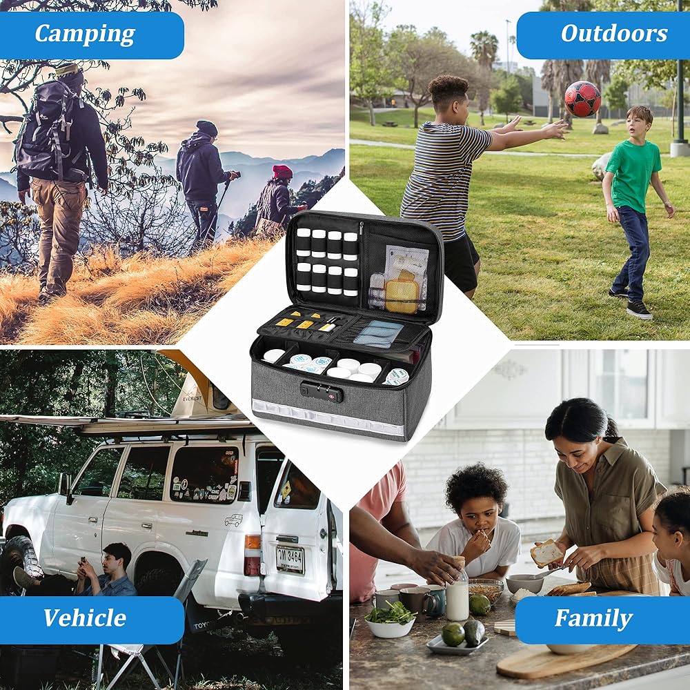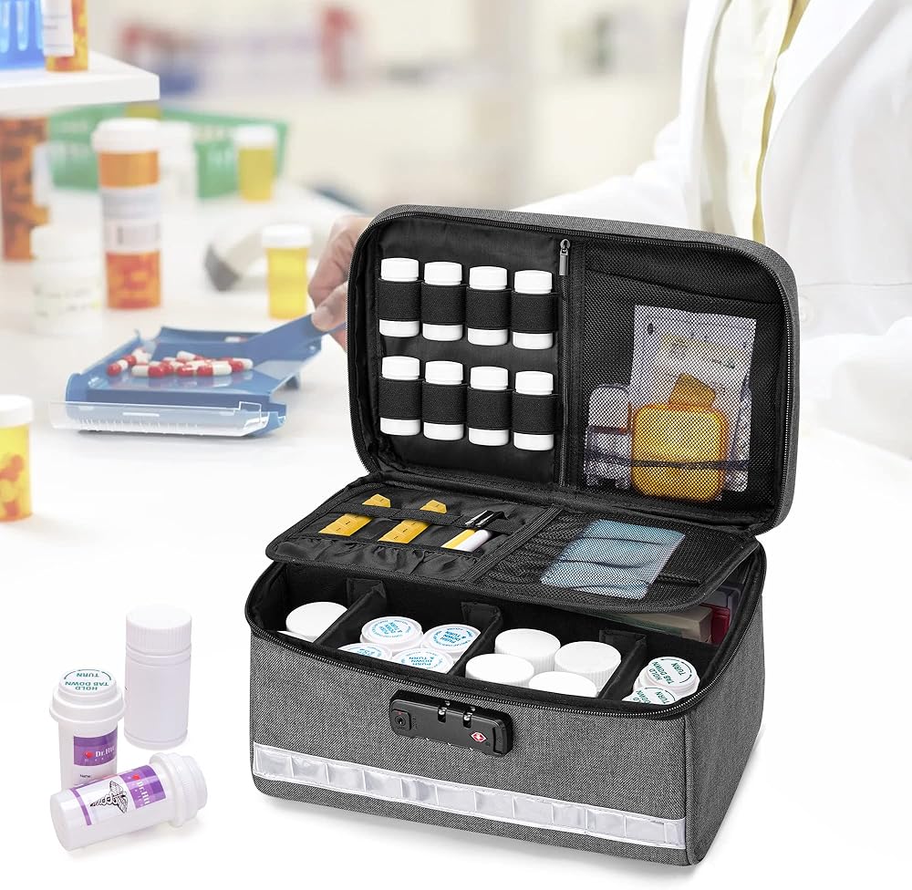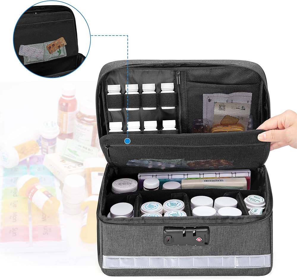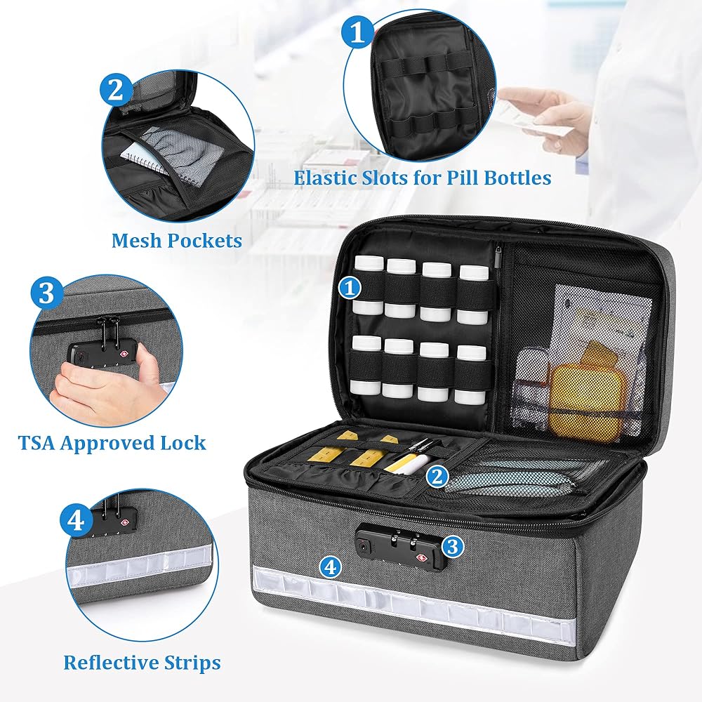 【Security and Privacy】: Our pill bottle storage bag matches with a rugged 3-digit combination lock to guard your medical stuff safe. You can set up your own password according to the instructions on the tag come with the bag.