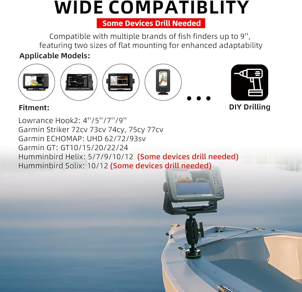 Our Fish Finder is compatible with a variety of fish finder brands, including Garmin, Lowrance, Humminbird, Raymarine, Furuno, and Simrad. It supports fish finders up to 9 inches and is designed for versatility, accommodating multiple series within each brand, such as Garmin's ECHOMAP and GPSMAP series, Lowrance's HDS and Elite series, and others.