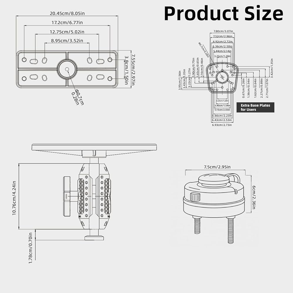 Package Includes: 2x High-Strength Base Plates for Enhanced Compatibility, 1xBasic Mount, 1xTelescopic & Detachable Underwater Inspection Arm,10xCable Ties,1xUser Guide