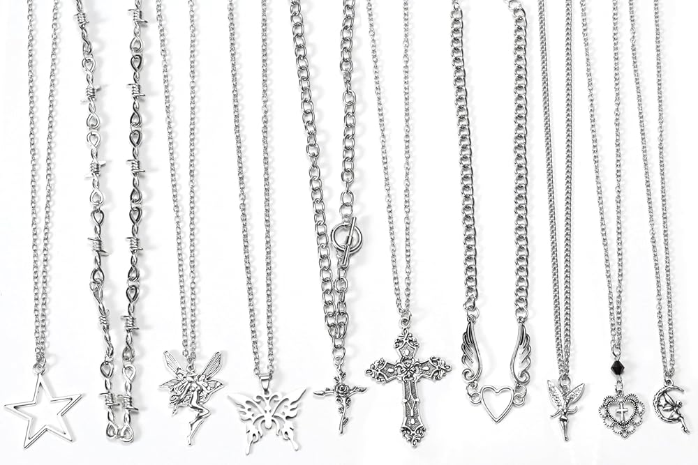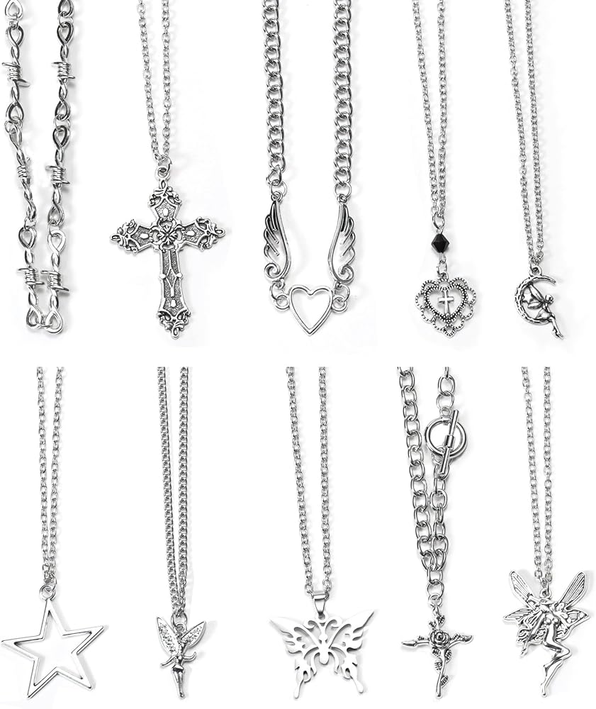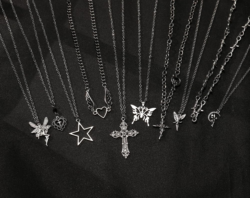 10 Pcs Grunge Necklace Set for Women Men, Goth Silver Necklace Set Y2k Vintage Jewelry, Cross Gothic Fairy Thorns Angel Heart Feather Star Butterfly Pendant Necklaces