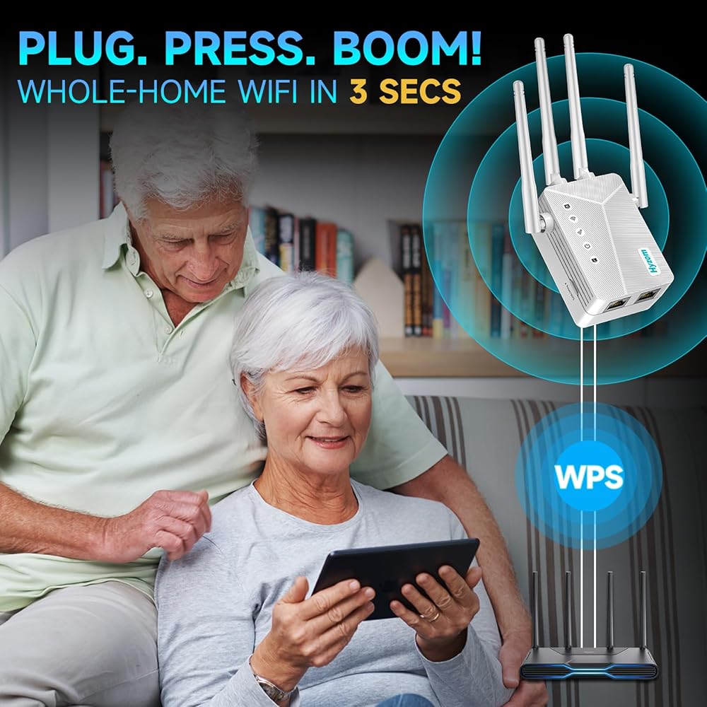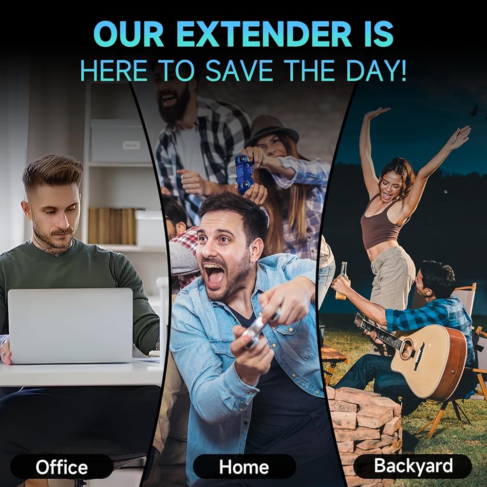 8-Second Setup with Any Router: Compatible with Google, Eero, and most routers. Use as a WiFi repeater wireless signal booster: press WPS for instant activation or browser-configure in minutes. Ideal for outdoor WiFi extender installations from backyard to home office