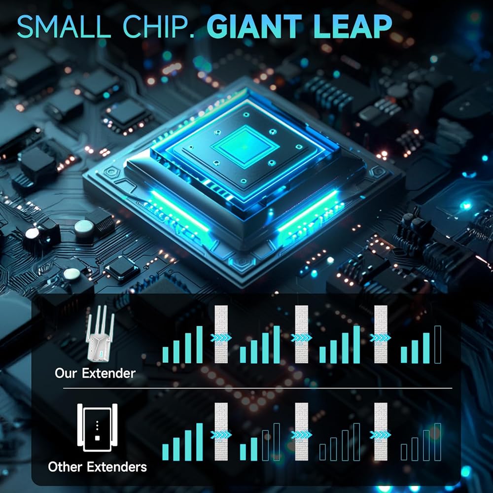 Bionic Chip & Long-Range Penetration: Powered by an advanced Bionic Chip and 4 high-gain antennas, this internet extender WiFi booster achieves 5X faster speeds. Maintain lag-free gaming on PS5/Xbox and buffer-free Zoom calls on your laptop, even through multi-story homes