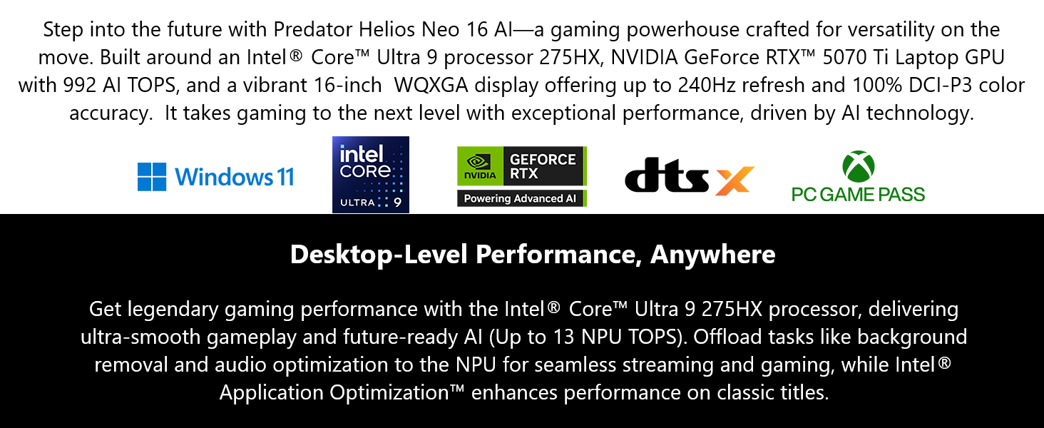 Engineered To Outperform: Step into the future with Predator Helios Neo 16 AI—a gaming powerhouse crafted for versatility on the move. Built around an Intel Core Ultra 9 processor 275HX, NVIDIA GeForce RTX 5070 Ti Laptop GPU with 992 AI TOPS, and a vibrant 16-inch WQXGA display offering up to 240Hz refresh and 100% DCI-P3 color accuracy. It takes gaming to the next level with exceptional performance, driven by AI technology. (NH.U0UAA.002)