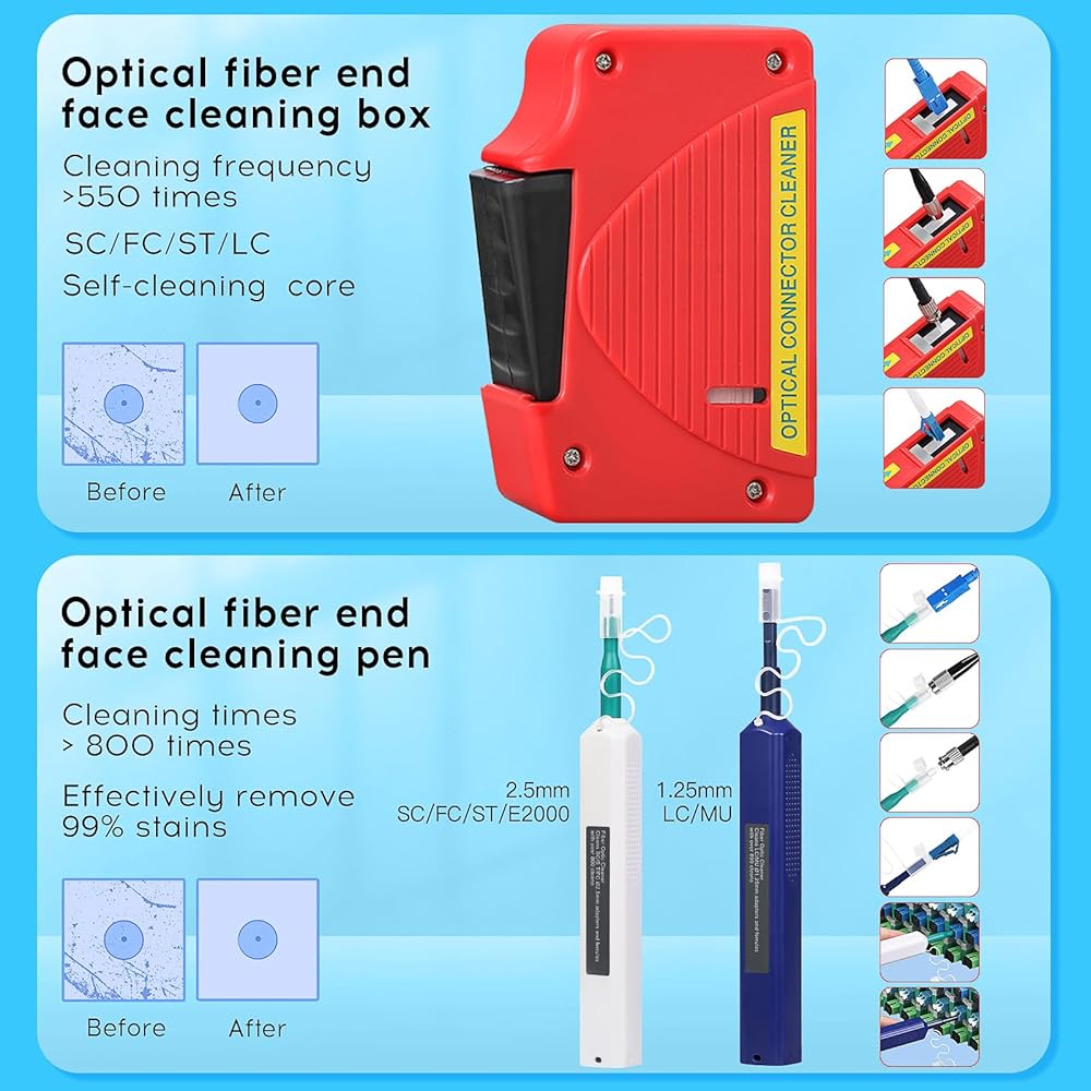 【cleaning frequency】 fiber optic cleaning box can be cleaned approximately 550 times, and comes with a replacement core for the cleaning box. After using up the cleaning core in the cleaning box, it can be reused by simply replacing it, thus saving costs. Fiber optic cleaning pen: approximately 800 times of cleaning, automatically replacing the cleaning wire after cleaning to avoid secondary pollution when cleaning again
