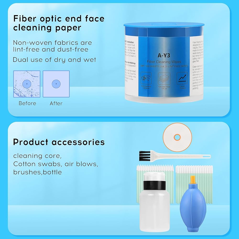 【Dust-free paper】Fiber optic dust-free paper: Soft and thick non-woven fabric wiping material, lint free and dust-free, suitable for both dry and wet use. Wet use: wipe bare fibers to reduce fusion losses, dry use: can absorb water stains. And it is also equipped with a sealed bag to prevent dust pollution