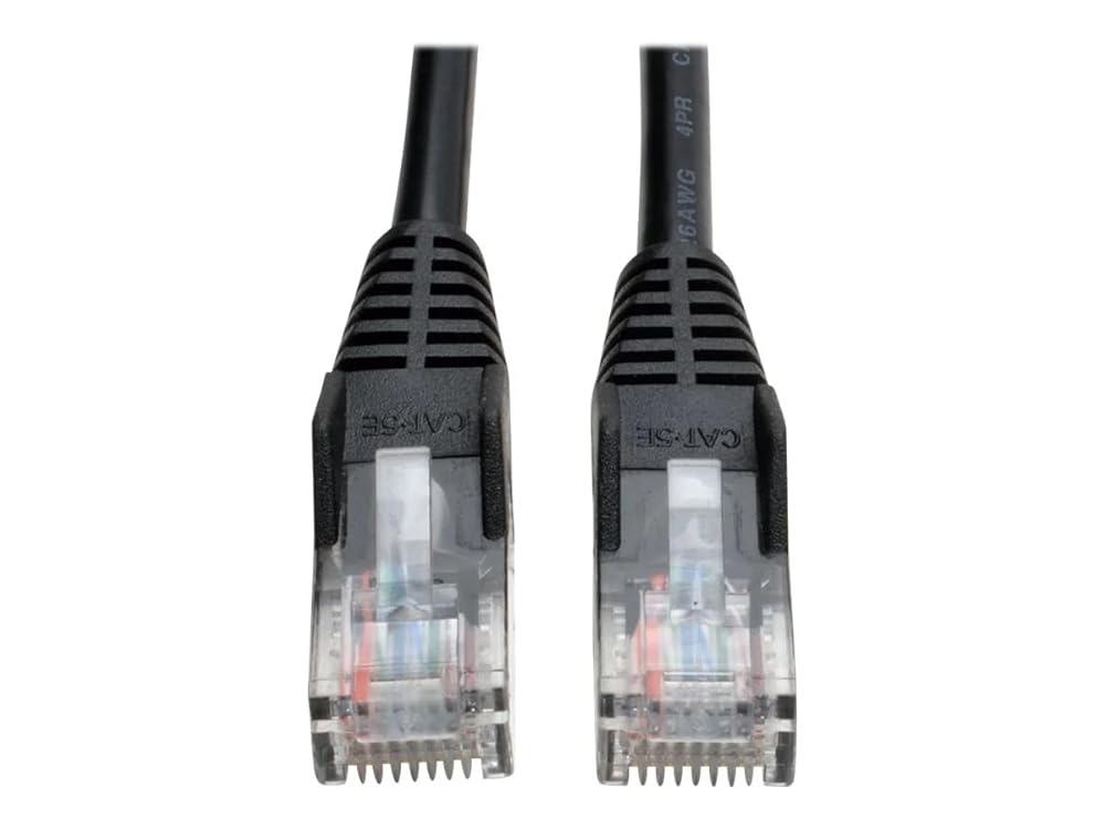 Eaton Tripp Lite Series Cat5e Ethernet Cable model N001-014-BK delivers reliable high speed connectivity for home office and enterprise networks Designed for gigabit data rates this 14 ft black patch cable features unshielded twisted pair UTP construction rated to 350 MHz and one gigabit performance Snagless molded boots protect RJ45 connectors during installation and removal while rugged PVC jacket resists bends abrasion and wear Supports power over ethernet PoE for IP cameras wireless access points and VoIP phones Ideal for routers switches modems patch panels network appliances data centers and server rooms Preconfigured bundle eligible for cloud care services ensures plug and play setup Provides excellent signal integrity reduced crosstalk and fast data transmission perfect for video streaming online gaming voice conferencing and file transfers Compatible with Cat5e Cat5 and Cat3 devices for versatile LAN network expansion