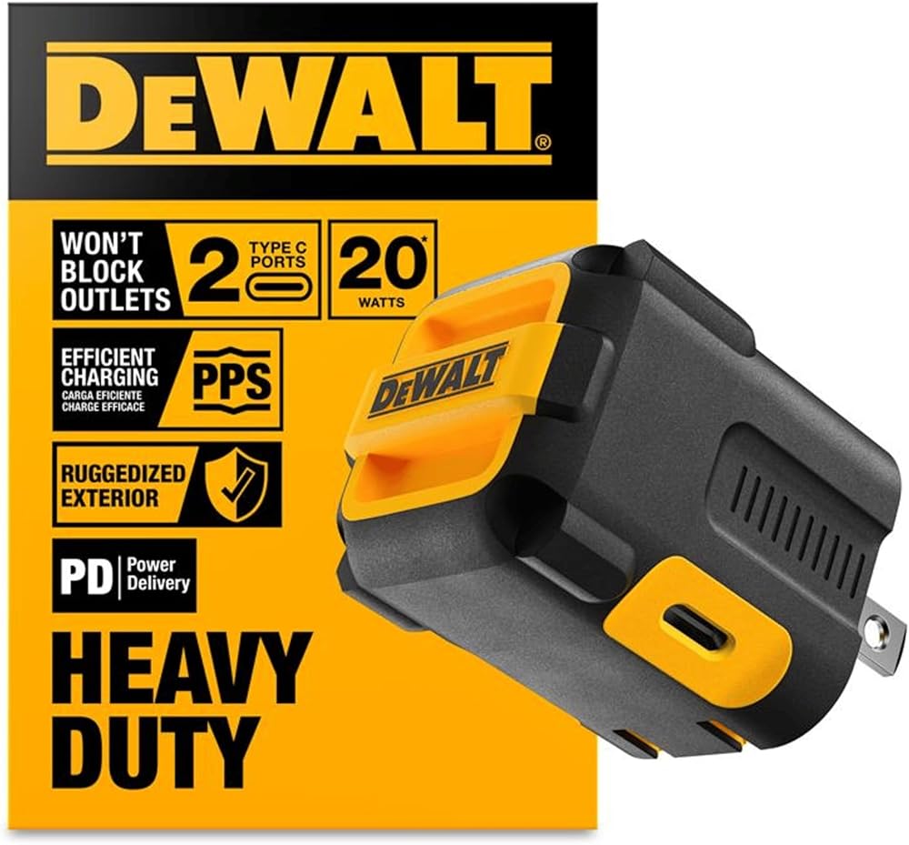 DEWALT Heavy Duty NeverBlock 20W Type C Charger, Dual Port Angled Cube Wall Adapter w/Foldable Plug, Patented Design Fast Charging Block for iPhone 17 16 15 14 13 Pro Max, Samsung Galaxy S24, HTC, LG