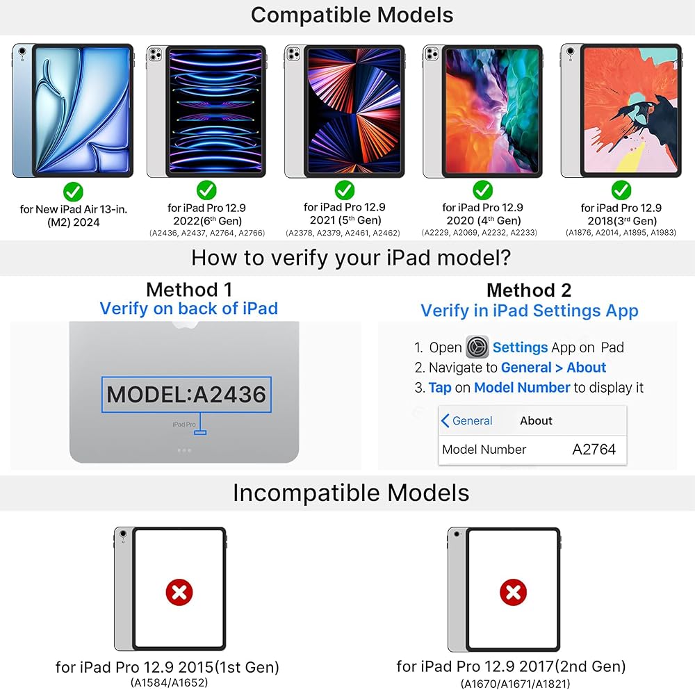 Compatibility - ONLY fit for iPad Pro 12.9 inch 6th Generation 2022 / 5th Generation 2021 / 4th Gen 2020 / 3rd Gen 2018 Without Home Button; Model Number: A2436, A2764, A2437, A2766, A2378, A2379, A2461, A2462, A2229, A2069, A2232, A2233, A1876, A2014, A1895, A1983. Four Colors for you to choose: black, purple, rose gold and silver.