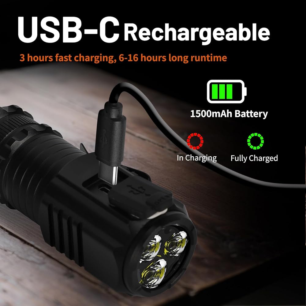 Durable & USB-C Rechargeable:This EDC flashlight has an anodized aircraft-grade aluminum body and is waterproof and impact resistant.Equipped with 1500 mAh rechargeable battery, it only takes 2 hours to fully charge. Red and green battery indicator light let you know the battery level at any time.