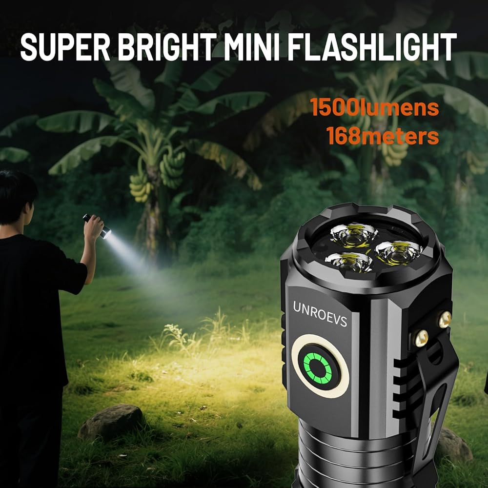 Portable EDC Flashlight:The mini flashlights adopts 3pcs super bright HI LED Chips, maximum brightness up to 1500lm,and 165° ultra-wide-angle floodlight, easily light up an entire room. The small powerful light is brighter than standard flashlights in its size.