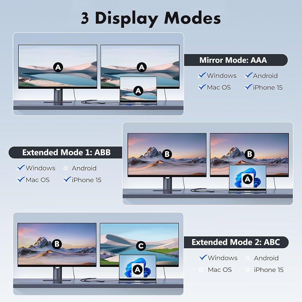 【Support for Mirror and Extended Mode】: The Windows system supports both mirror mode and extended mode (AAA, ABB, ABA, and ABC modes), while the Mac OS operating system only supports image mode. Due to limitations in Mac OS, it is not possible to extend 2 different screens, which will display the same image on the Mac (AAA and ABB modes). And the Android system only supports AAA mode.