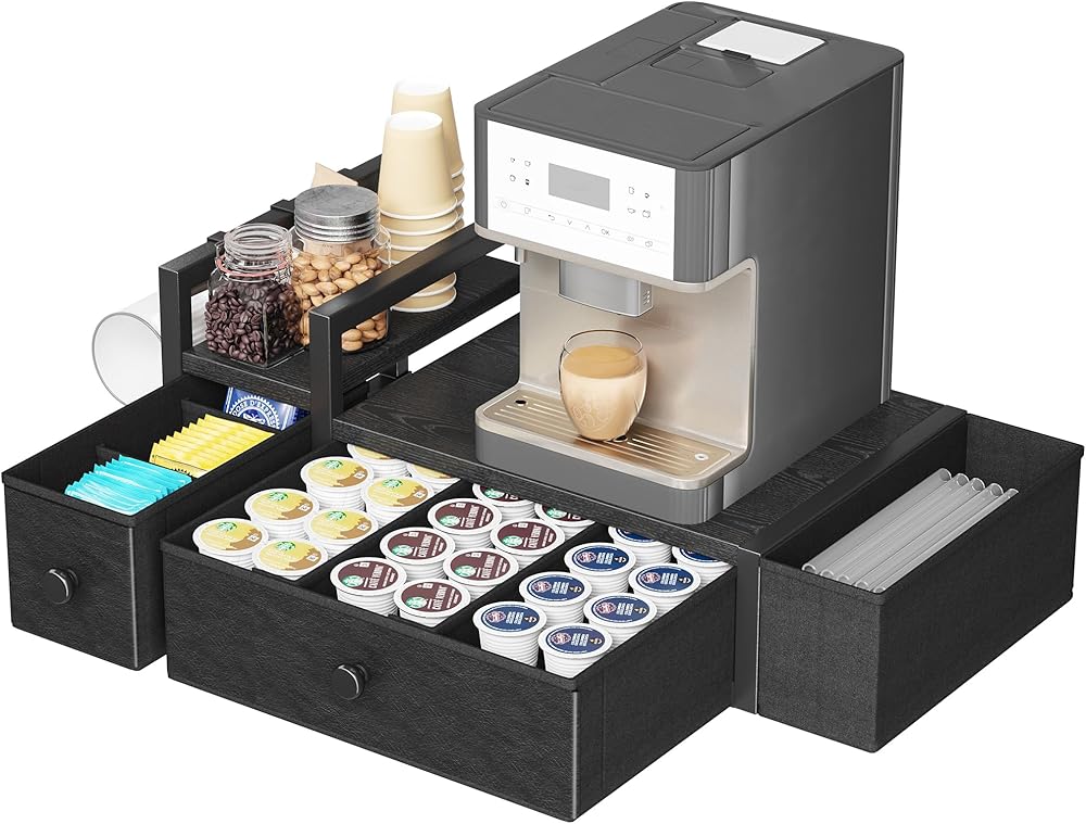 【Countertop Design】The k cup holder countertop measures 12 x 12 inches and can accommodate a coffee maker, toaster, water dispenser, etc. The left side of the K-Cup rack countertop can hold canned coffee beans or coffee cups that cannot be stored in the drawer.