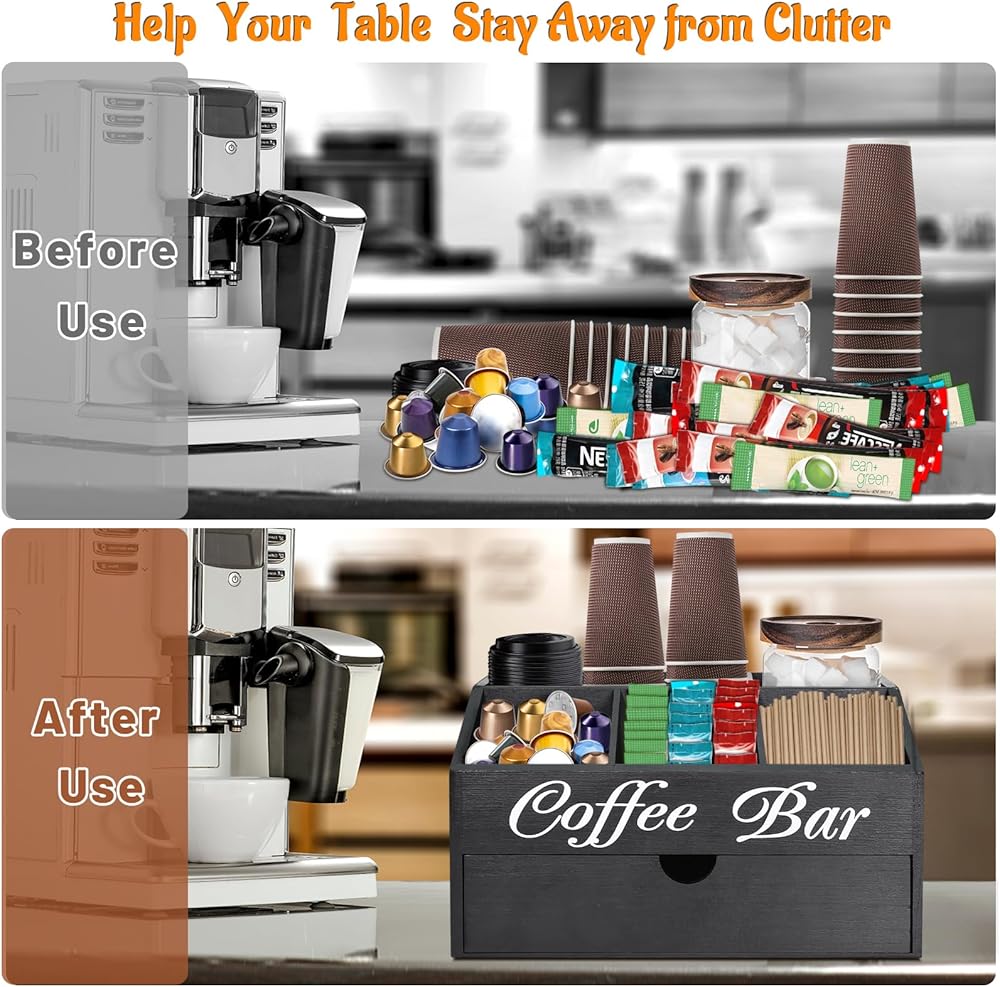 JUST RIGHT COFFEE BAR ORGANIZER: The drawer design provide a multifunctional coffee station organizer perfect for creating a clean and organized coffee space. This coffee bar organizer has 5 spacious compartments, the front 3 large capacity compartments can be used to store coffee pods, sugar, tea bags, instant coffee and more, and the rear two compartments have enough height to store your stack coffee cups, straws, stir sticks, canned coffee beans, etc. Can be easily stored as you need.