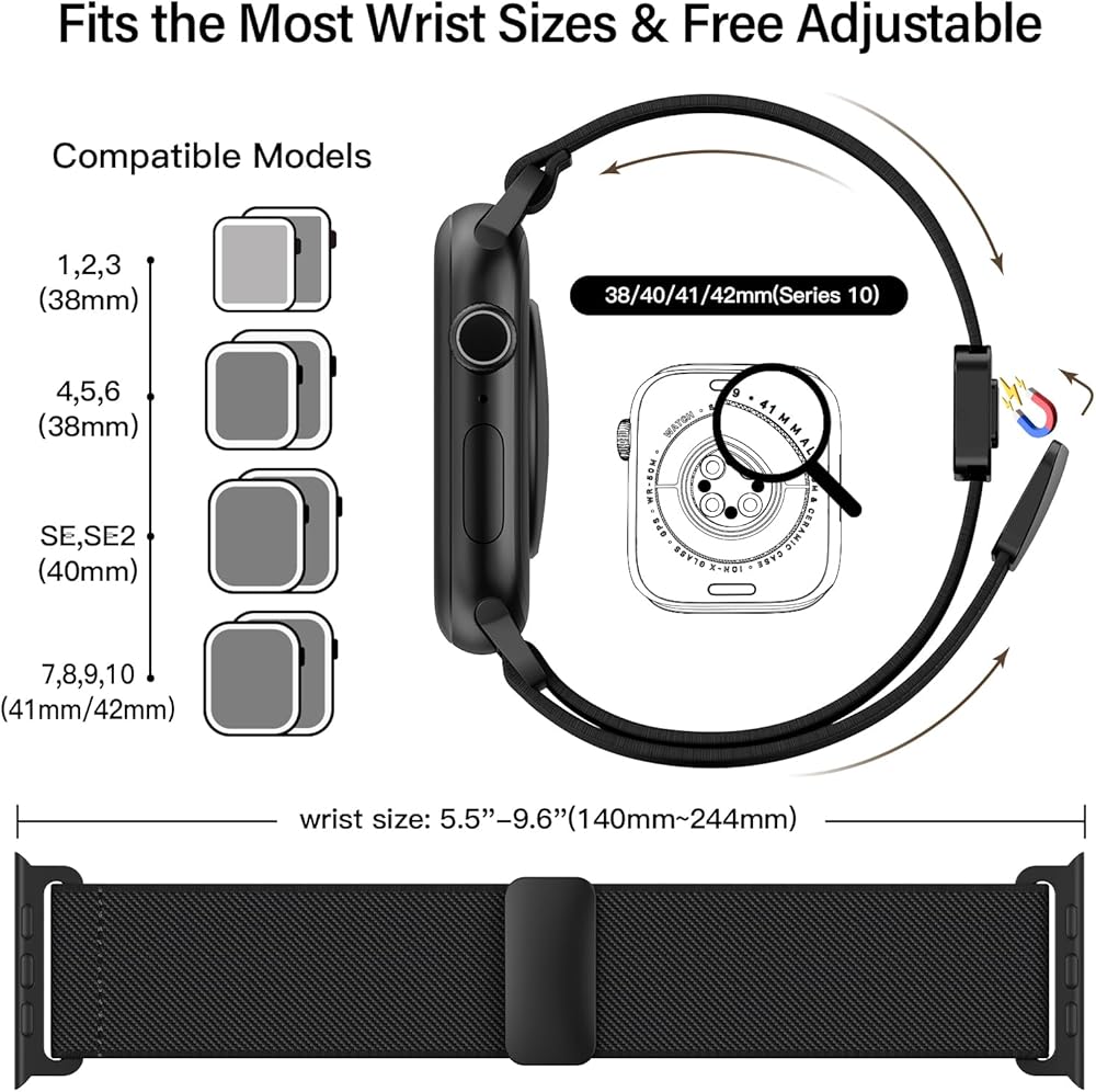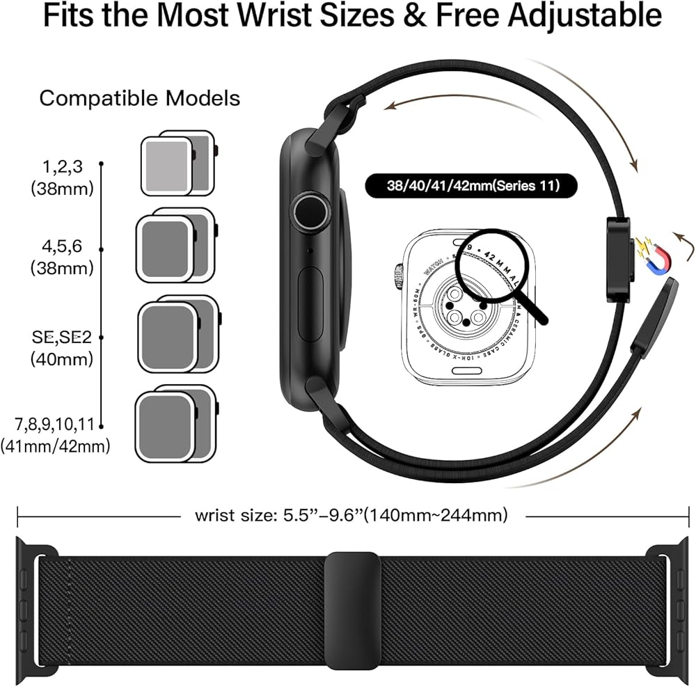 【Upgrade Magnetic Clasp & Easy Adjust】Our elastic Solo Loop bands for Apple Watch features an upgraded magnetic clasp and a reinforced stainless steel buckle. Easily to adjust the length with one-handed. Two sizes iWatch wrist straps designed for women and men: 5.11"–7.87" (130mm–200mm) compatible with 38mm, 40mm, 41mm, and 42mm (series 10), 5.51''-8.66'' (145mm-220mm) compatible with 44mm, 45mm, 49mm, 46mm(series 10). No watch slippage fears. No tool needed installation.
