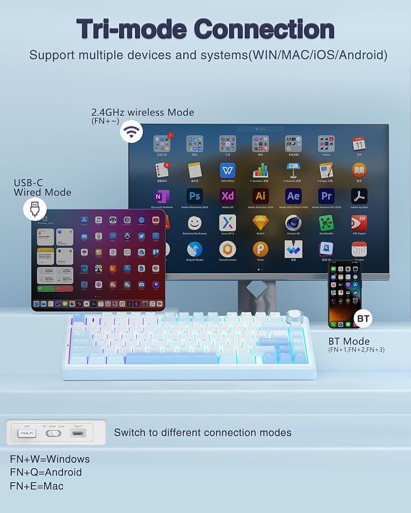 Tri-mode Connection Keyboard: AULA F75 wireless mechanical keyboard supports BT5.0, 2.4GHz wireless and USB wired connection, can connect up to five devices at the same time, and easily switch by shortcut keys or side button. F75 computer keyboard is suitable for PC, laptops, tablets, mobile phones, PS, XBOX etc, to meet all the needs of users. In addition, the rechargeable keyboard is equipped with a 4000mAh large-capacity battery, which has long-lasting battery life