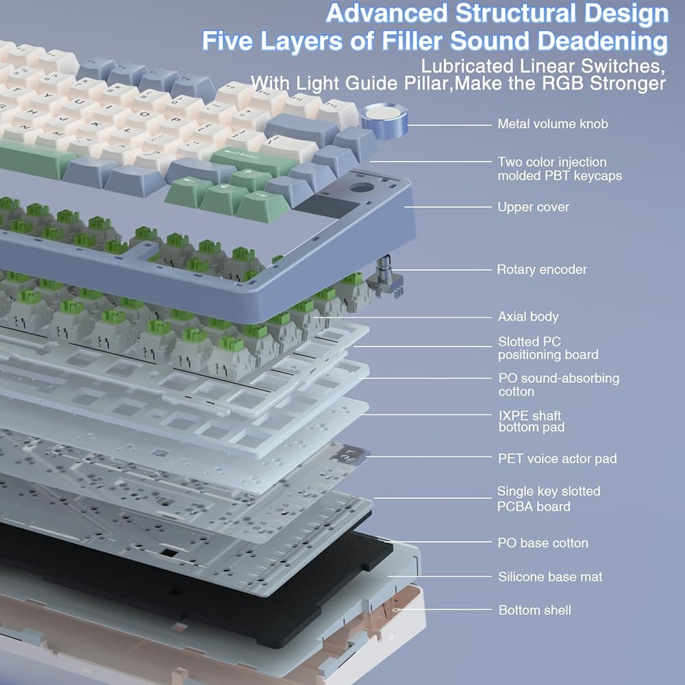 • Advanced Structure & PCB Single Key Slotting: This thocky heavy mechanical keyboard features an advanced structure, extended integrated silicone pad, and PCB single key slotting, better optimizes resilience and stability, making the hand feel softer and more elastic. Five layers of filling silencer fills the gap between the PCB, the positioning plate and the shaft,effectively counteracting the cavity noise sound of the shaft hitting the positioning plate, and providing a solid feel