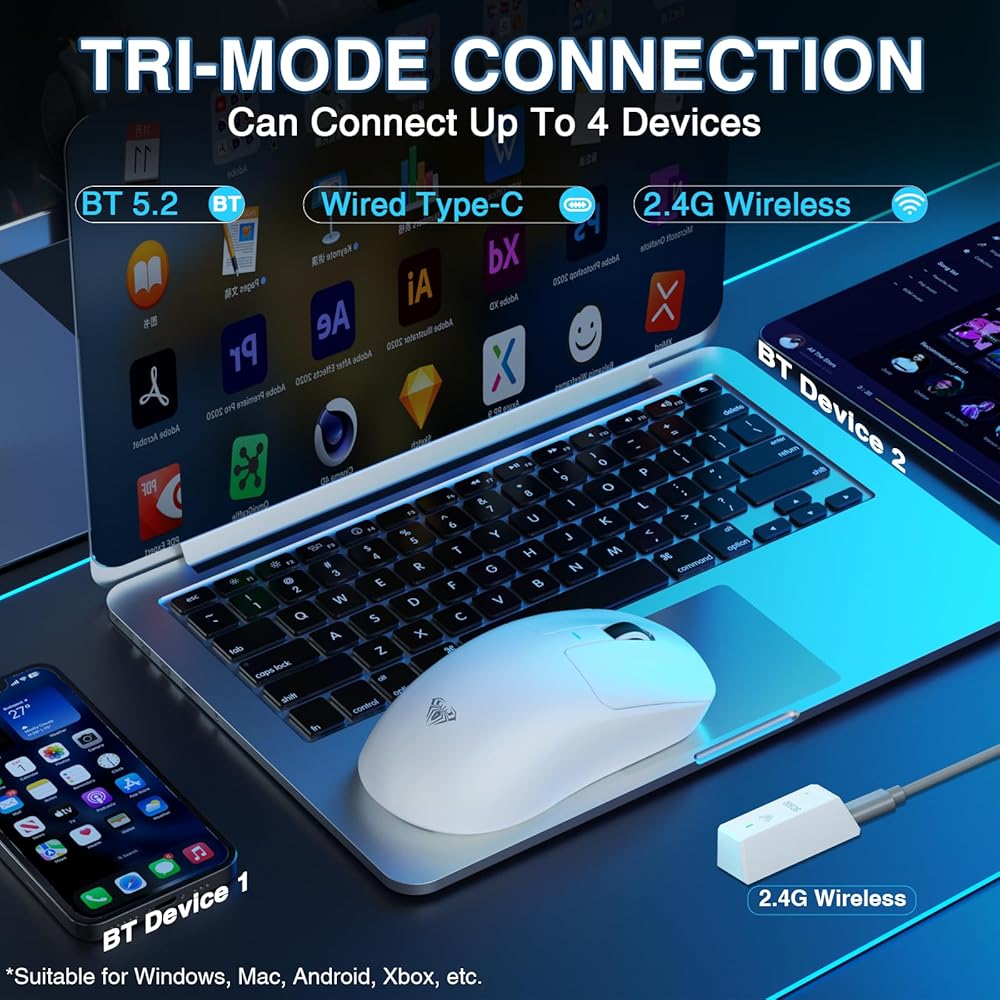 • Tri-Mode Wireless Mouse: This gaming mouse supports connecting USB-C, 2.4GHz wireless, and 2*BT5.2 devices, Seamlessly switch between devices such as PCs, laptops, and tablets, allowing you to use it flexibly in various scenarios. It is also compatible with multiple systems such as Windows 7/8/10, Vista, XP, Mac, Windows 2000, and Linux