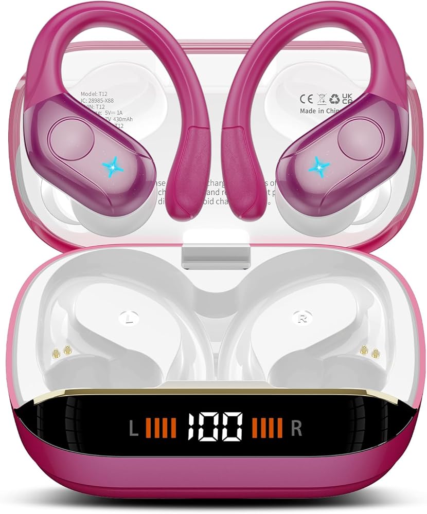 Wireless Earbuds Bluetooth 5.4 Headphones Sports 75H Stereo Deep Bass Over Ear Buds with Earhooks, Bluetooth Earbuds with 4 ENC Mic, LED Display, IP7 Waterproof Earphone for Running, Rose Gold