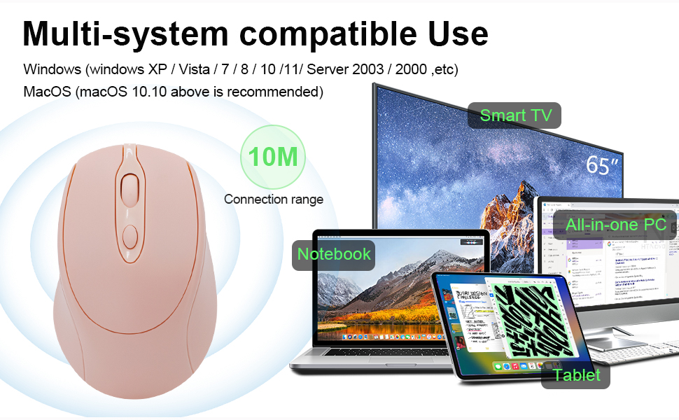 PC Mouse with Wide Compatibility: This laptop mouse is easy to use. 2.4Hz Wireless Mode works with the laptop, desktop, or any device with a USB port, simply plug in the USB receiver, plug in, and play. Bluetooth mode works with Windows, Android, and MAC OS systems. Please Note: BT5.2 System Requirement: Windows 8.0, Windows 10 or later; Mac OS X 10.10 or later;iPad OS 13 or later/ Android 5.0 or later. Please check or update the operating system before using it.
